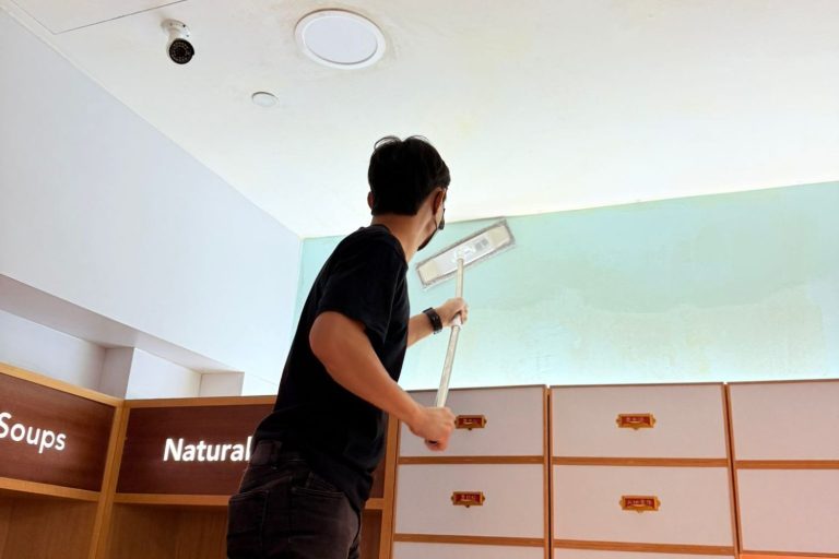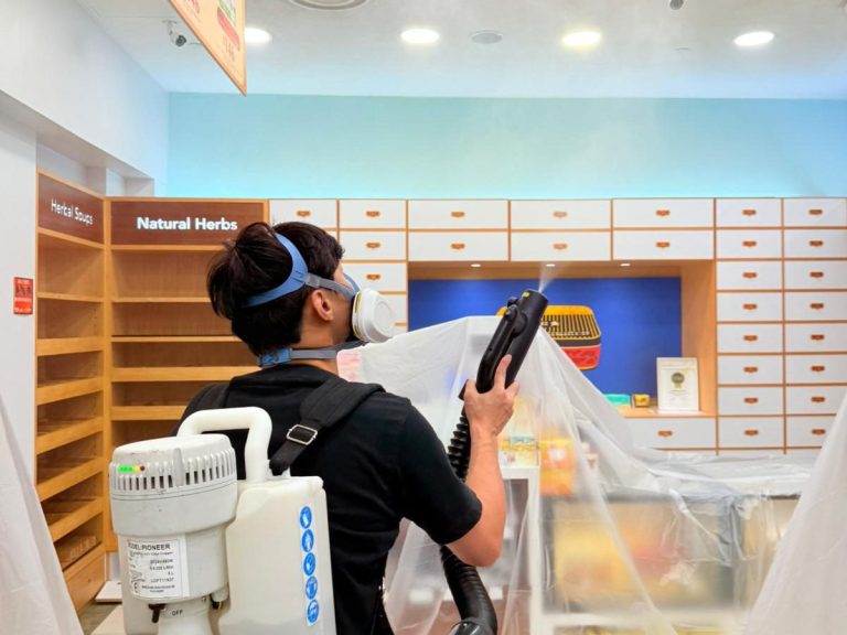 Misting a chemical solution to eliminate lingering spores in the air and prevent spread.